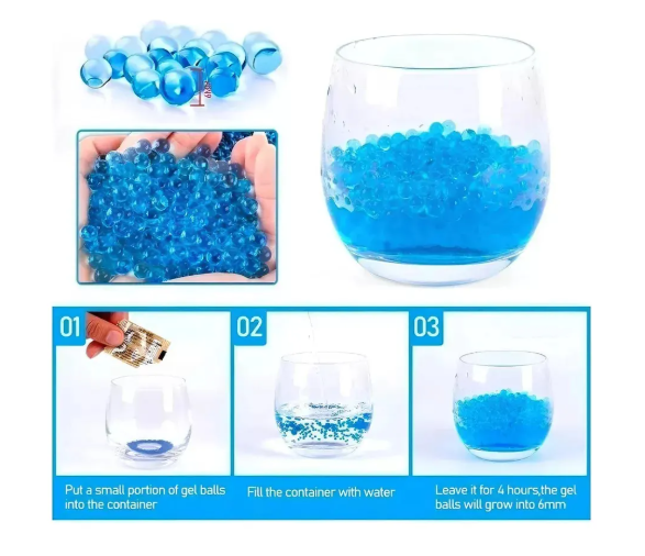 Solo debes hidratar las bolas de gel en agua durante más de 4 horas hasta que alcancen su tamaño ideal (7-8 mm). Luego, cárgalas en el rifle y estarás listo para comenzar la batalla. ¿Sencillo? Sí. ¿Divertido? Muchísimo. 😎